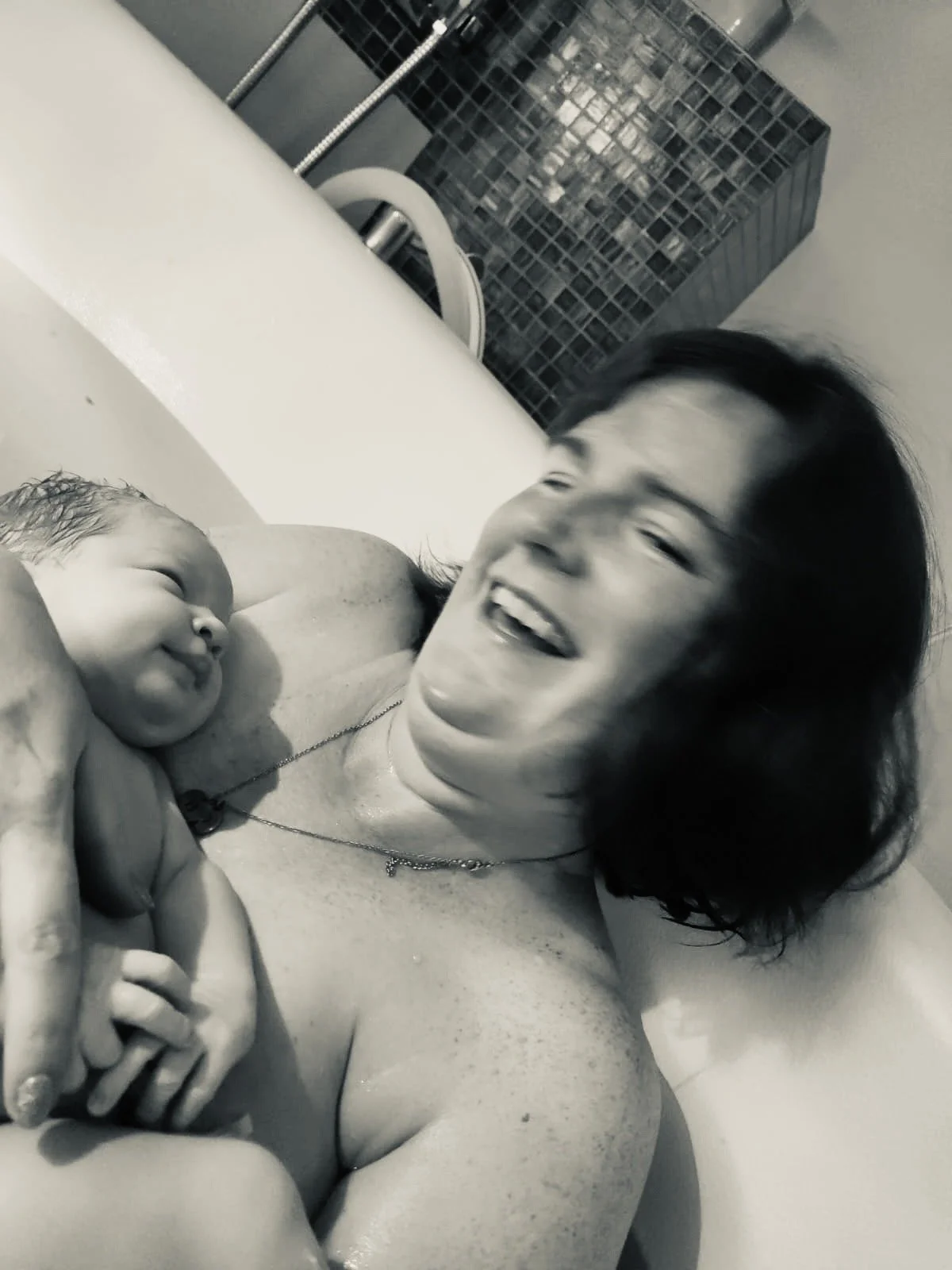 Once the head was out I knew one more push and my baby would be here. The midwife directed me to reach down and pick up my baby. I knew straight away it was a boy when he sat into my hands and it was the most surreal experience to have him in my arms. He was born at 6.53am so only 20 mins after getting in the pool. A total of 8 hrs from the first twinges! I did have a perineal tear which required stitches but my recovery was much easier than after the epidural and episiotomy. I was back home in my own bed on the Saturday that my induction was booked for!